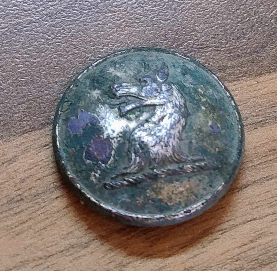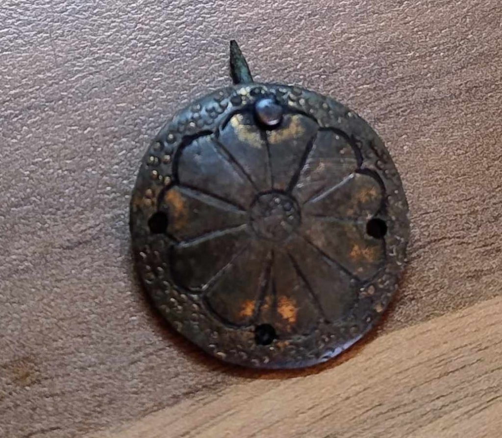 Following a few hours in the garden detecting, accompanied by her daughter’s boyfriend, Monica had a few interesting finds, namely a button featuring a wolf’s head and a pendant with a floral motif.