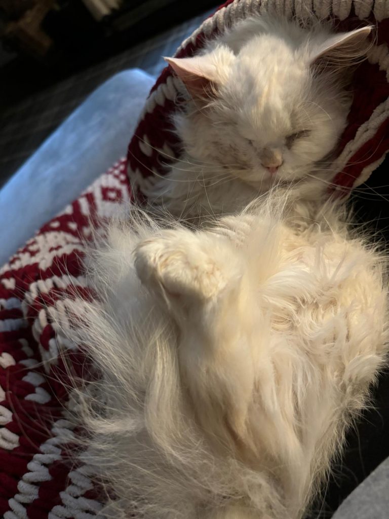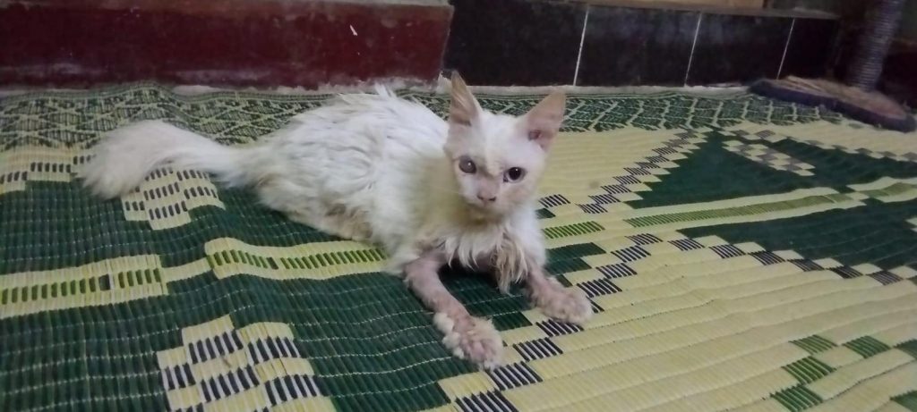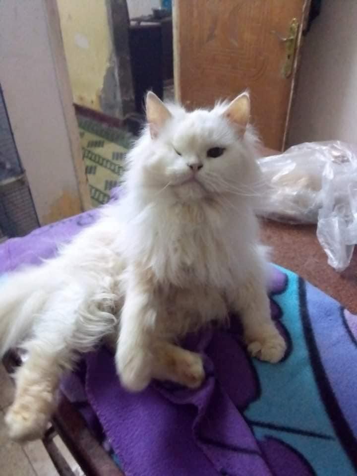 One cat stood out for us – a young long-haired female cat from Egypt with one eye and a wonky jaw. The cat’s rescue mom, a lady called Manar, had made multiple posts over a period of nearly two years seeking a home for this little cat, explaining that she had found her after she had been hit by a car, an accident which cost the cat an eye and a healthy jaw. When Manar found her, the cat had only a poor chance at survival. However, she wanted to live – and thanks to Manar and her team, against the odds, she made a miraculous recovery. Unfortunately, despite repeated pleas for adoption, she was not so lucky at finding a home – and two years on, was still in Manar’s care.