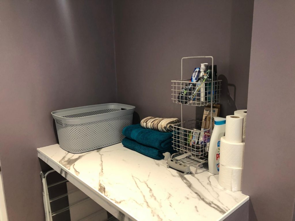 You might also notice that the bathroom was originally a fair bit smaller. That is because the doorway was originally where the little half wall was – and the little half wall originally formed part of a small hallway closet. We moved the doorway out further and took the wall down to half height so we could make a laundry space (there is a fitting for a washing machine in the cavity below the shelf). In such a small cottage, this seemed like a super logical use of the room – and it also allowed us to use up the scraps from the shower surround to make the little shelf!