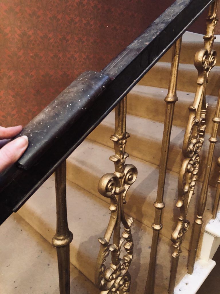 The amount of dust and detritus that was shaken loose by the removal immediately put paid to our assumption that the cover was recent – it was clear that the cover had been in situ for a lot longer than even 10-15 years. And what we uncovered was definitely sad, but not exactly surprising, following our brief forays into the loose seam: the bannister rail was, sadly, almost entirely gone, aside from a few haphazardly (and oddly?) chopped pieces left on the flat along the first floor landing. The bannister core remained, though with some significant damage to the scroll at the bottom of the staircase and various bits of missing mahogany veneer here and there along the sides.