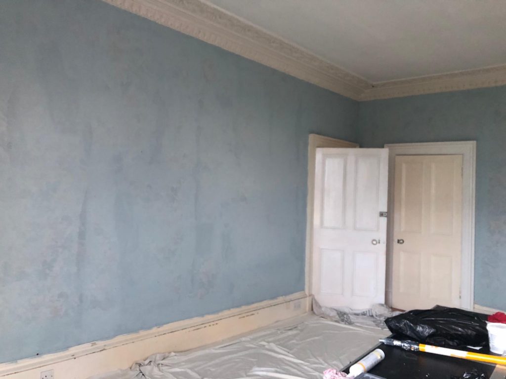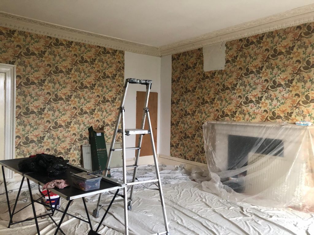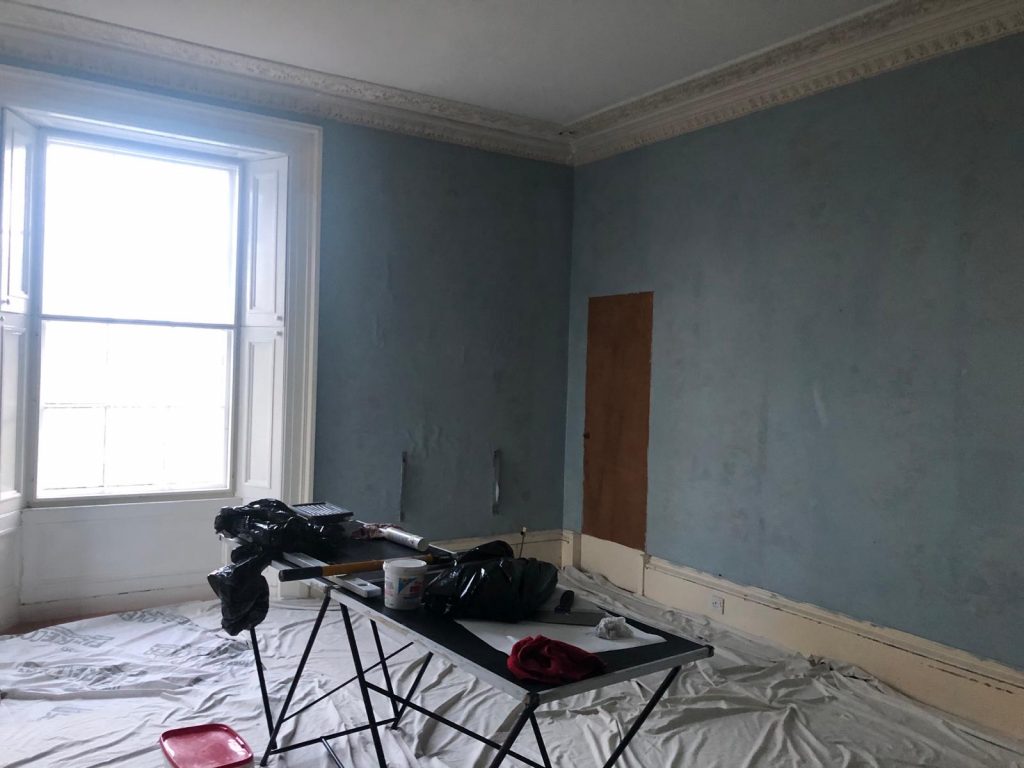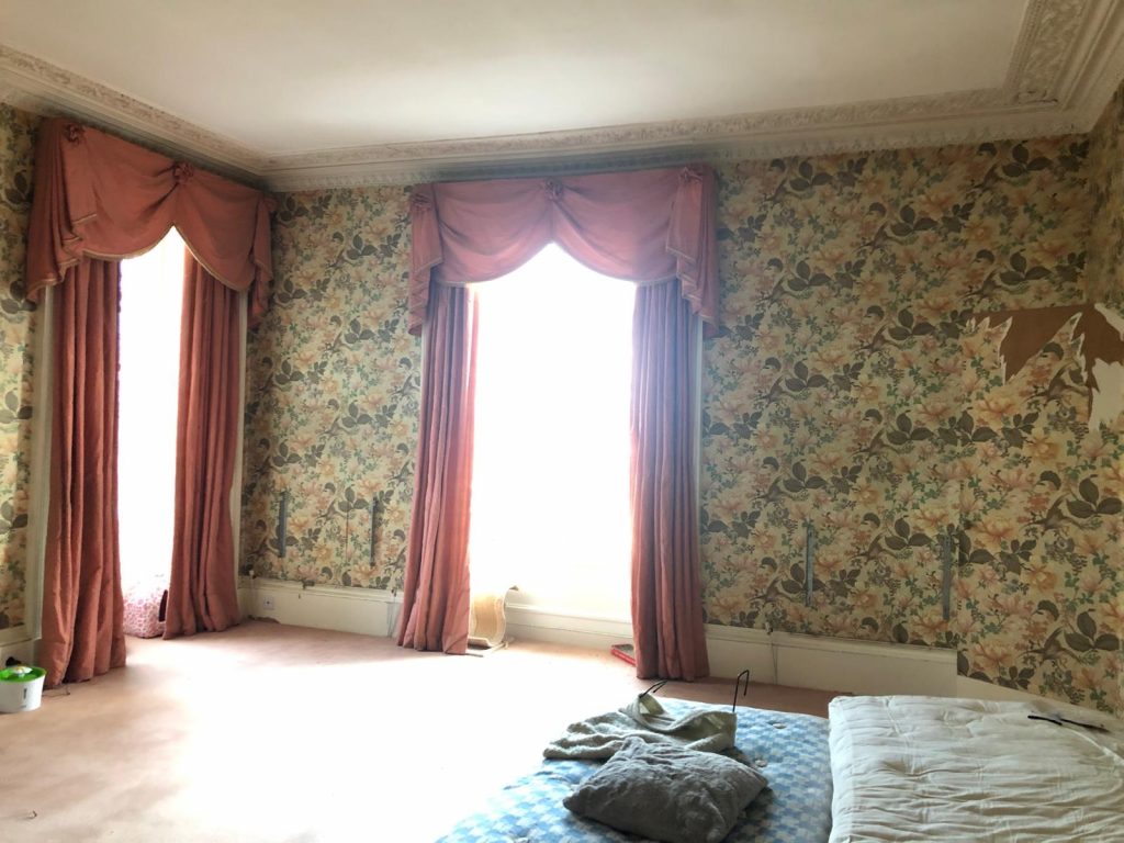 Here are a few shots of his prep work (radiators off the wall, curtains and pelmets down, everything wiped down ready to go):