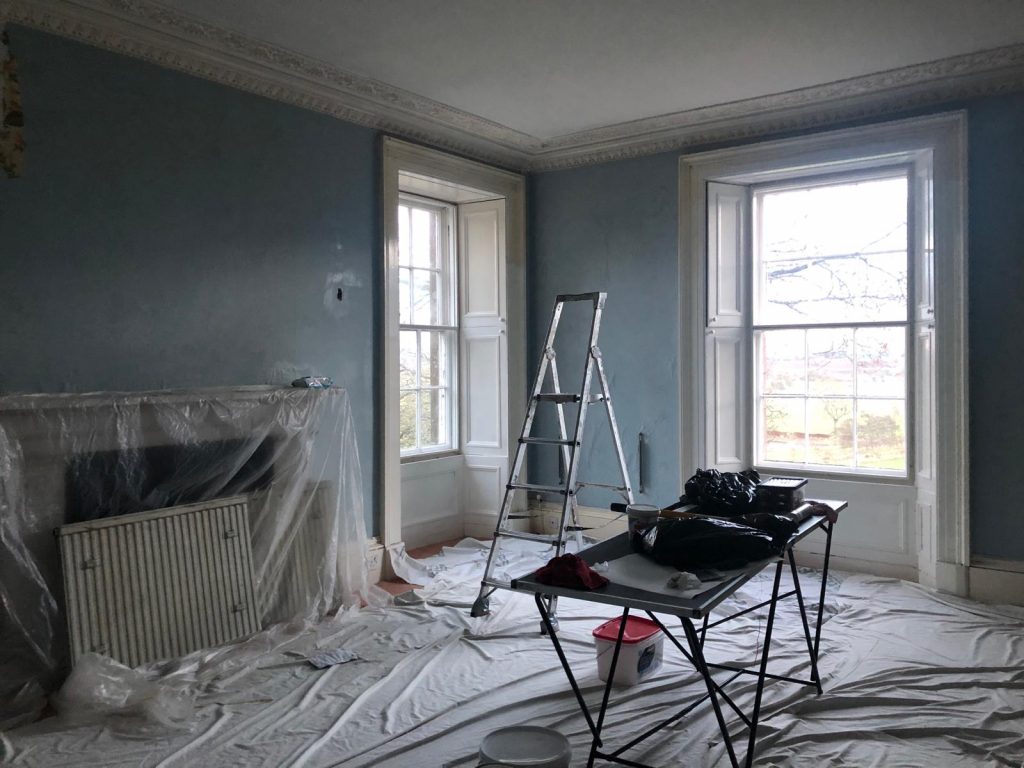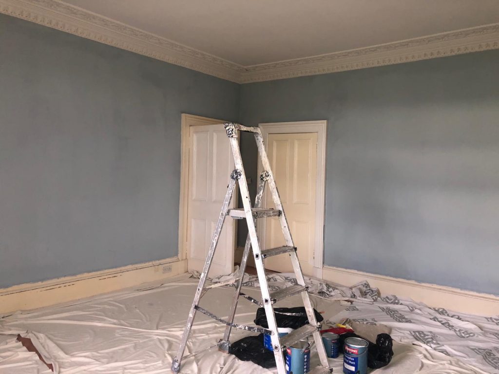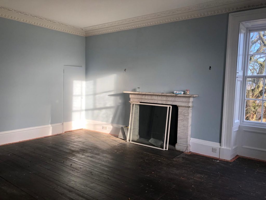 We were particularly anxious about handling the cornicing, as we wanted the lightest possible application of paint so as not to clog up the details any further, which had obviously already been painted many times in the past. After the first coat of wall paint, David used his sprayer to get a nice even yet light coating on the cornicing, which really started to pull the room together.