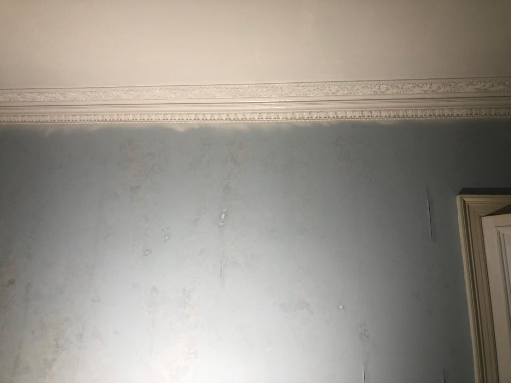 With the second coat of the Parma Gray, the walls started to look a lot better, and the overspray from the cornicing was cleaned up.
