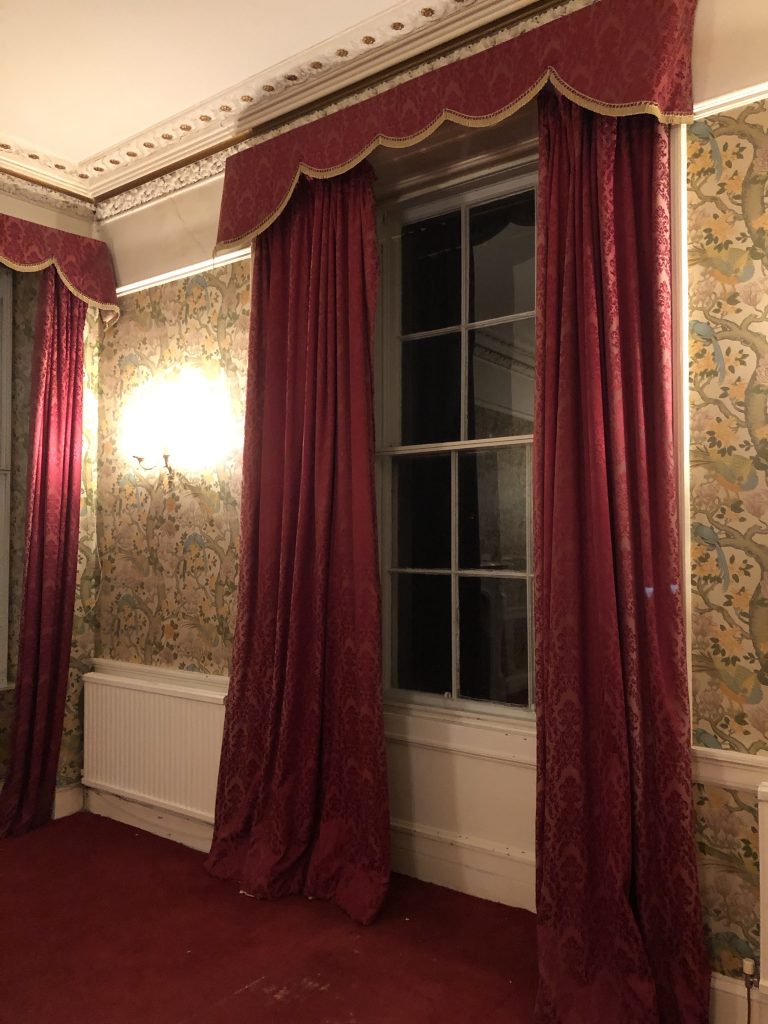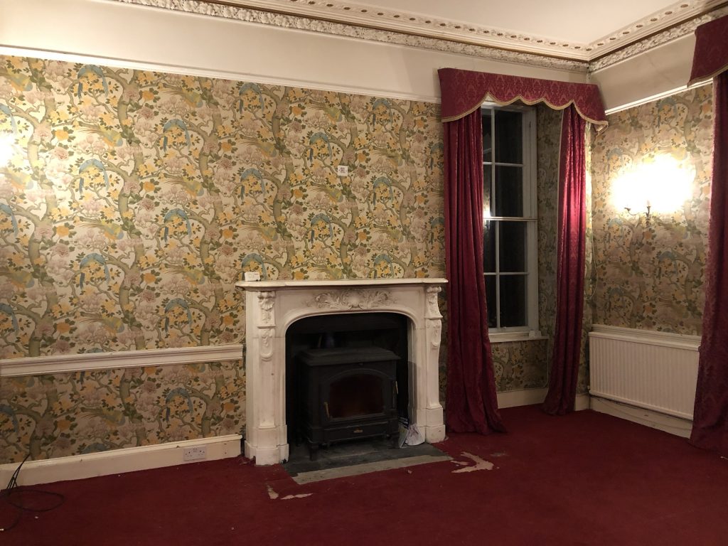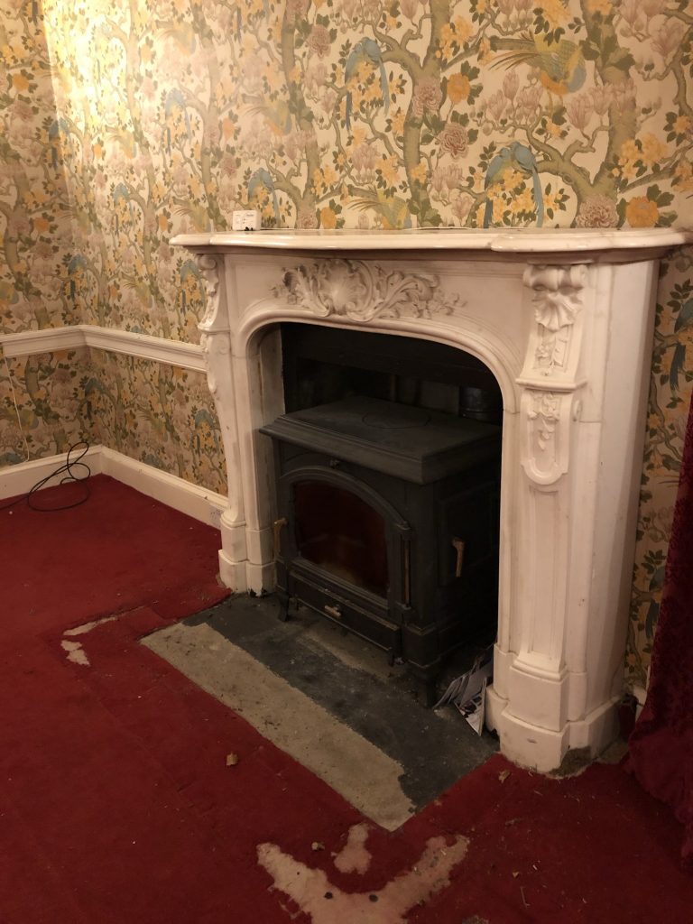 The carpet in the photo is a red Wilton velvet carpet and would have been classed (and still is classed) as a luxury carpet beyond the types of carpet you’d pick up at a big box carpet retailer. These are the types of carpet you’d see in National Trust properties, and we were told by a local carpet expert that stately homes generally avoid modern loop or pile carpets when they carpet a space, which makes sense – he gave us a few samples to try for another room and they looked super out of place in the house. Sadly, the carpet was fairly threadbare, as you’ll see in the later photos, having been the unfortunate target of some carpet moths and damaged by the cast iron fender of the fireplace through years of use.