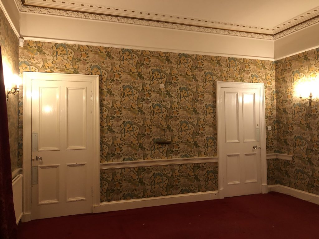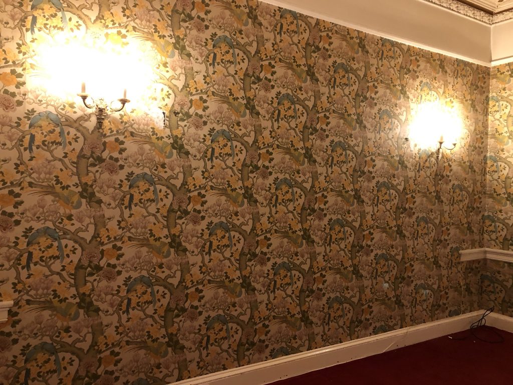 The wallpaper you see in the photo is a Morris & Co pattern that I think was probably manufactured by Sanderson in the 70s (the original Morris & Co dissolved around WWII, but prior to that, was renowned for high quality wallpapers and fabrics in Victorian times; its pattern catalogue continues via Sanderson today). It features a pretty wild bird scheme (something that echoes throughout Bardmony; we’ve been told Mrs N- was extremely fond of birds). Unfortunately, it’s no longer in production, and it had been quite badly stained over the years with both water and smoke.