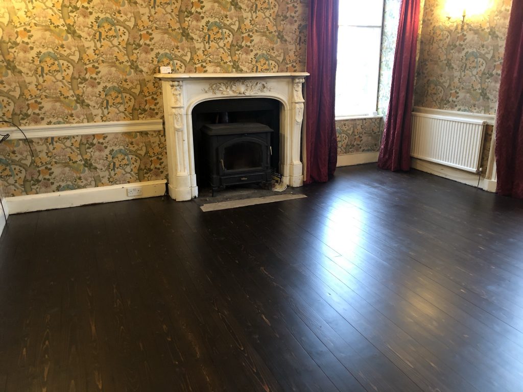 Obviously, we have quite a bold Morris wallpaper print going on here. We also have some gold trimmy bits on the coving. Ignore the carpet – that’s sorted. If you don’t remember where we left off following the floor work, voila, another refresher: