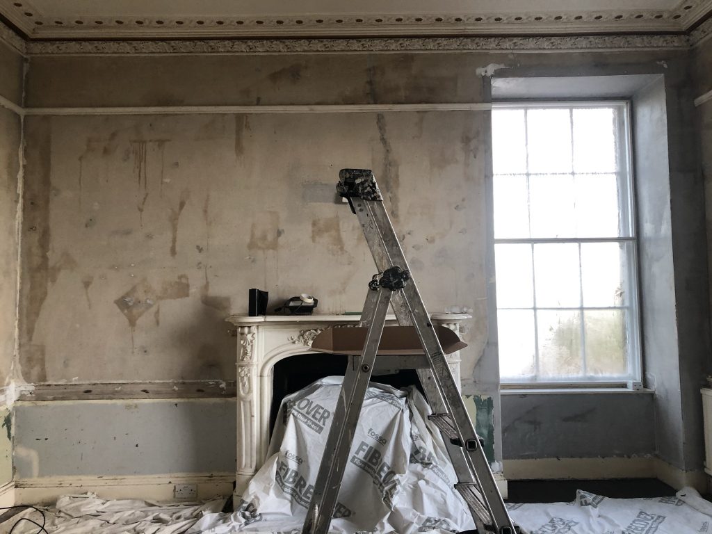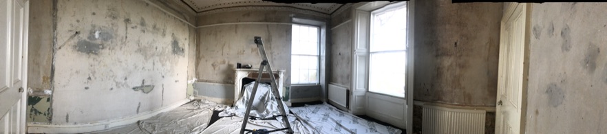 I am impressed by the level of work just to smarten up the room so you can move forward with the decorating. The end result looks great and the plain coloured walls give a much more Georgian feel. Whether or not to keep the fragmentary dado rail is indicative of the very many decisions you have to make in a period home.