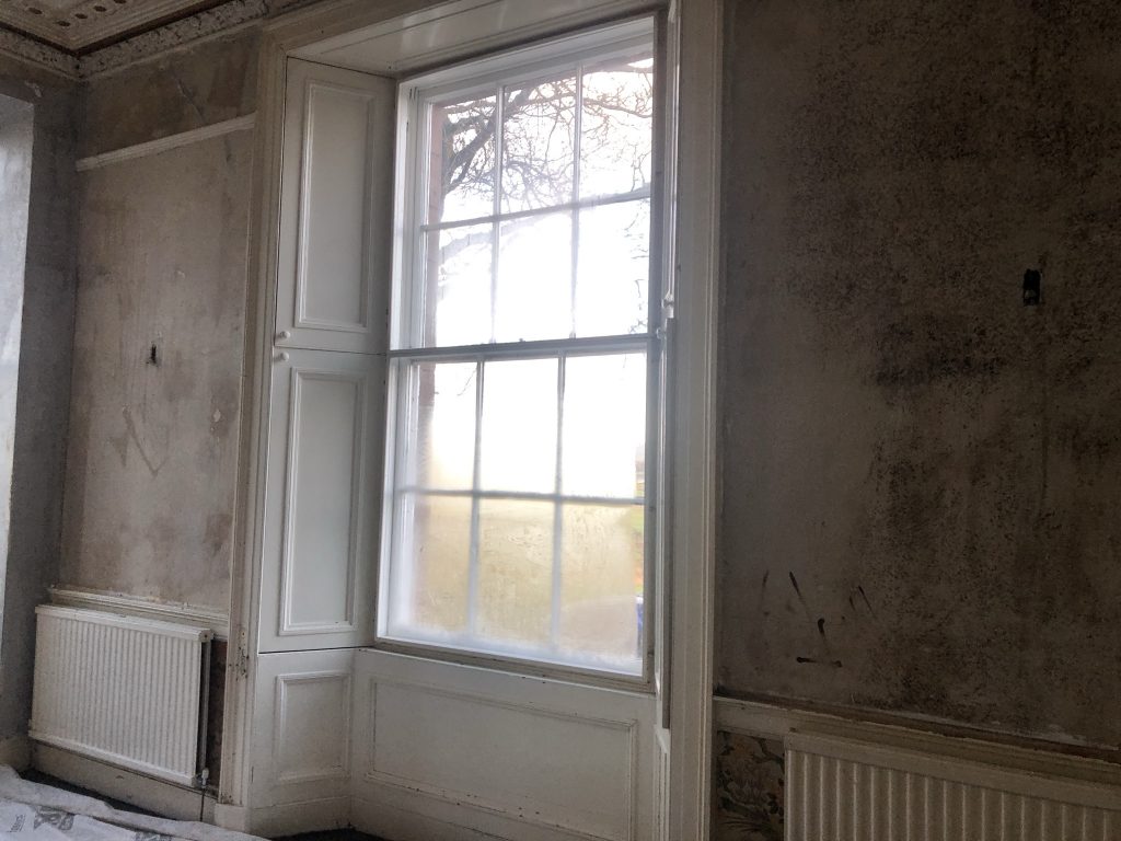 Third, the window by the fireplace is NOT original! It never really twigged for me that it was missing shutters, paneling, and architrave, as it had previously been covered up with the window treatments. Once those were down, I had blithely assumed that it was a legacy quirk of the house. However, underneath the paper, it is quite clear to see that it is much newer plasterwork surrounding the window, suggesting it was built in at a later date. Our surprise find was confirmed by looking at a very old photo of the house we found online that shows the east side of the house – sans window!