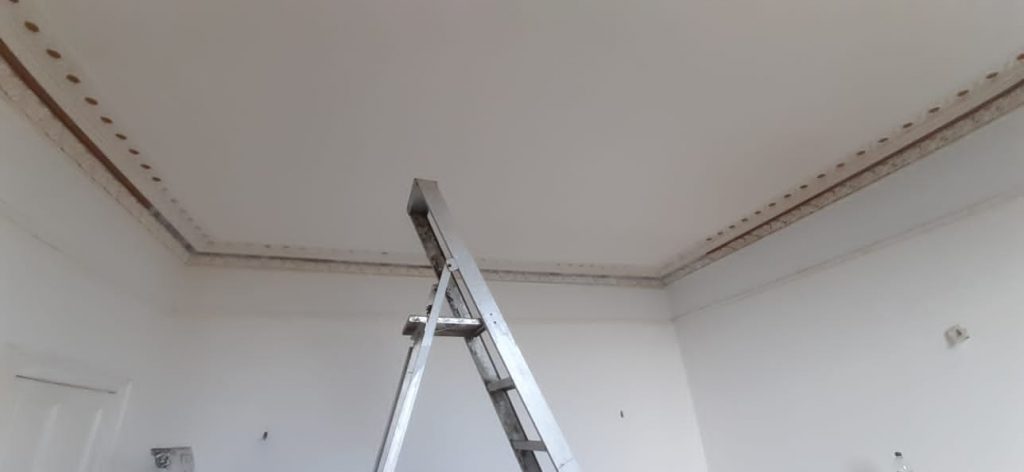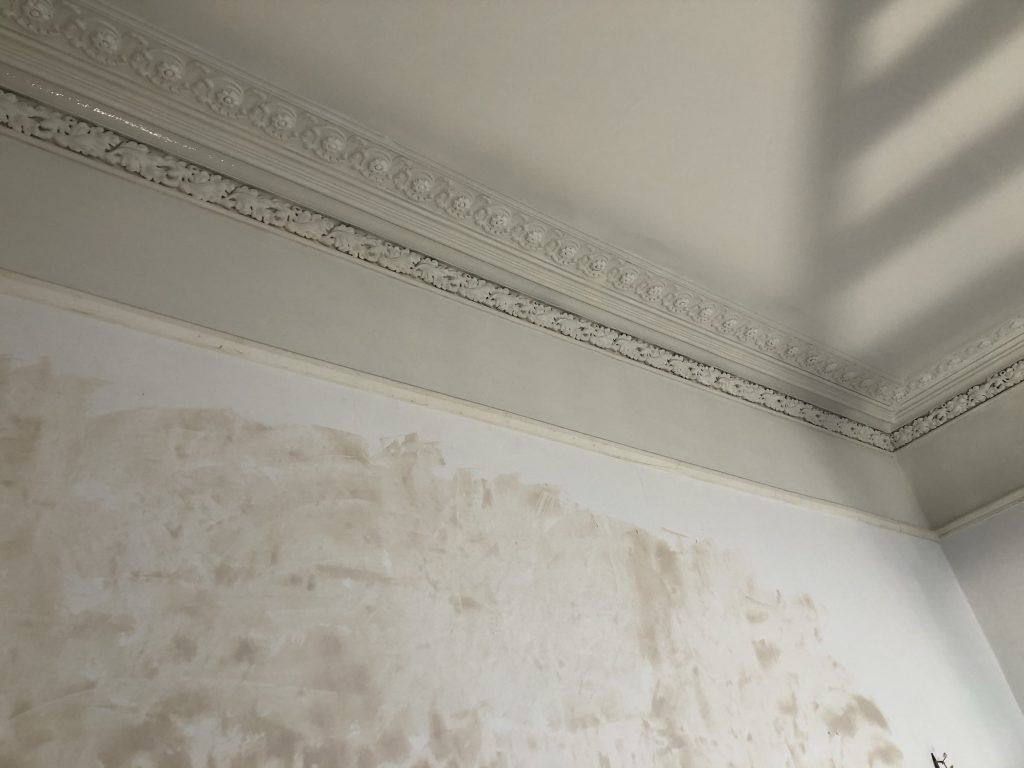 At this point, the ceiling, cornicing, and field above the picture rail received their initial coat of paint. The ceiling and the picture rail field were done with a roller but, as previously noted, the cornicing had to be sprayed to preserve the detail.
